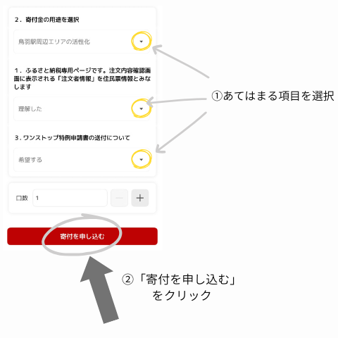 確認画面で、寄付金の用途・ワンストップ特例申請書の希望の有無などそれぞれ当てはまるものを選択し寄付を申し込みます。