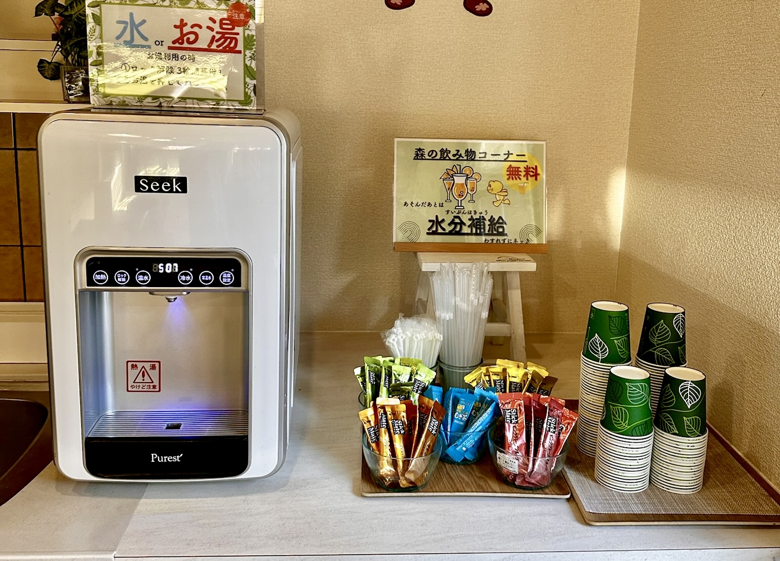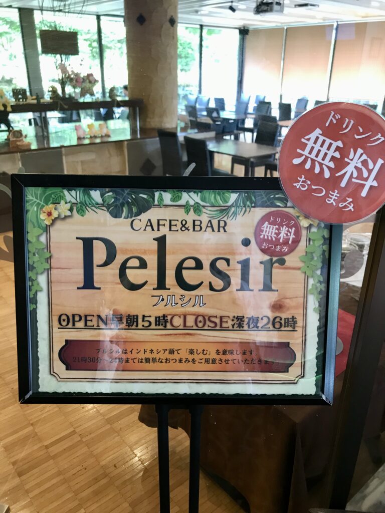 フロントすぐ横にある「カフェ&バー プルシル」は、チェックイン後すぐに利用できるカフェスペース。ジュースや紅茶、コーヒー、お茶など好きなドリンクを自由に楽しめます。