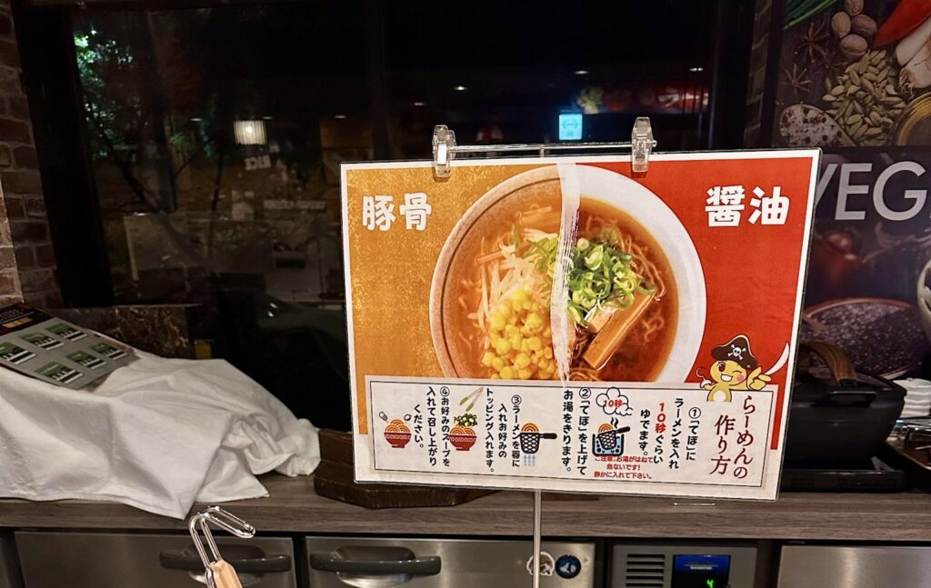 ラーメンは豚骨と醤油の2種類。トッピングは各自で自由に盛り付けられます。