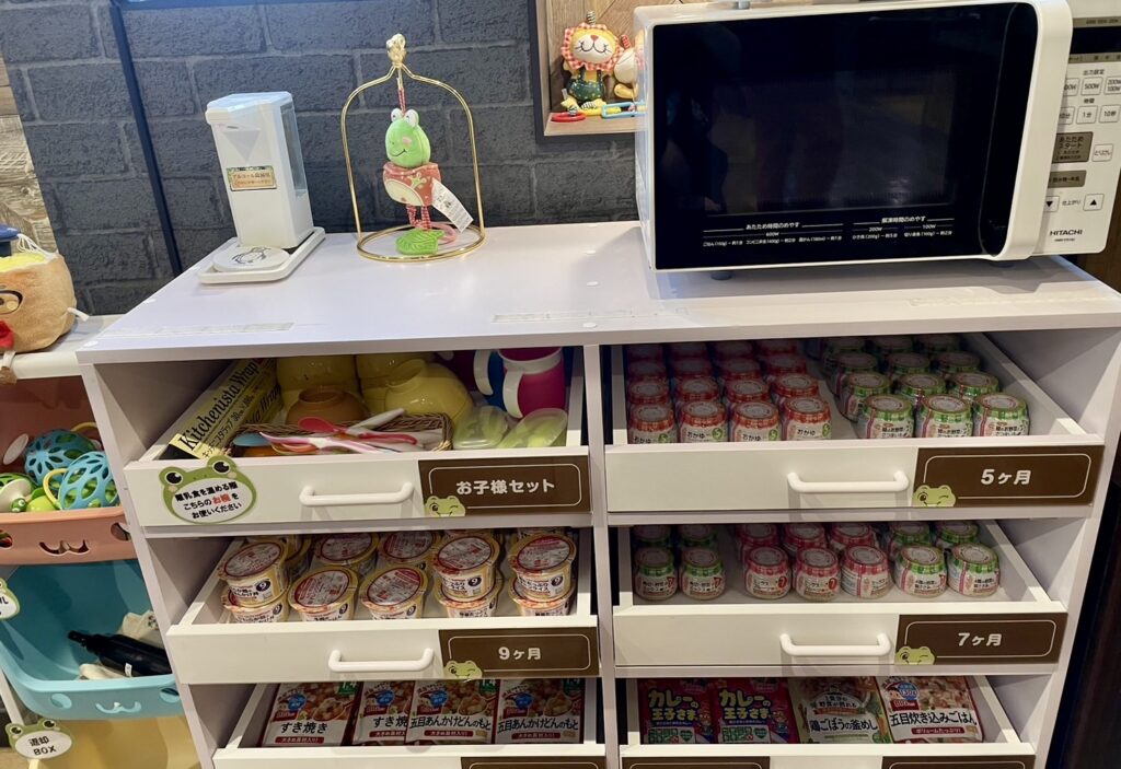 子供用のおもちゃや離乳食用のスプーン、お椀、エプロン、温め用のレンジも備えられています。そして驚いたのが離乳食の数!