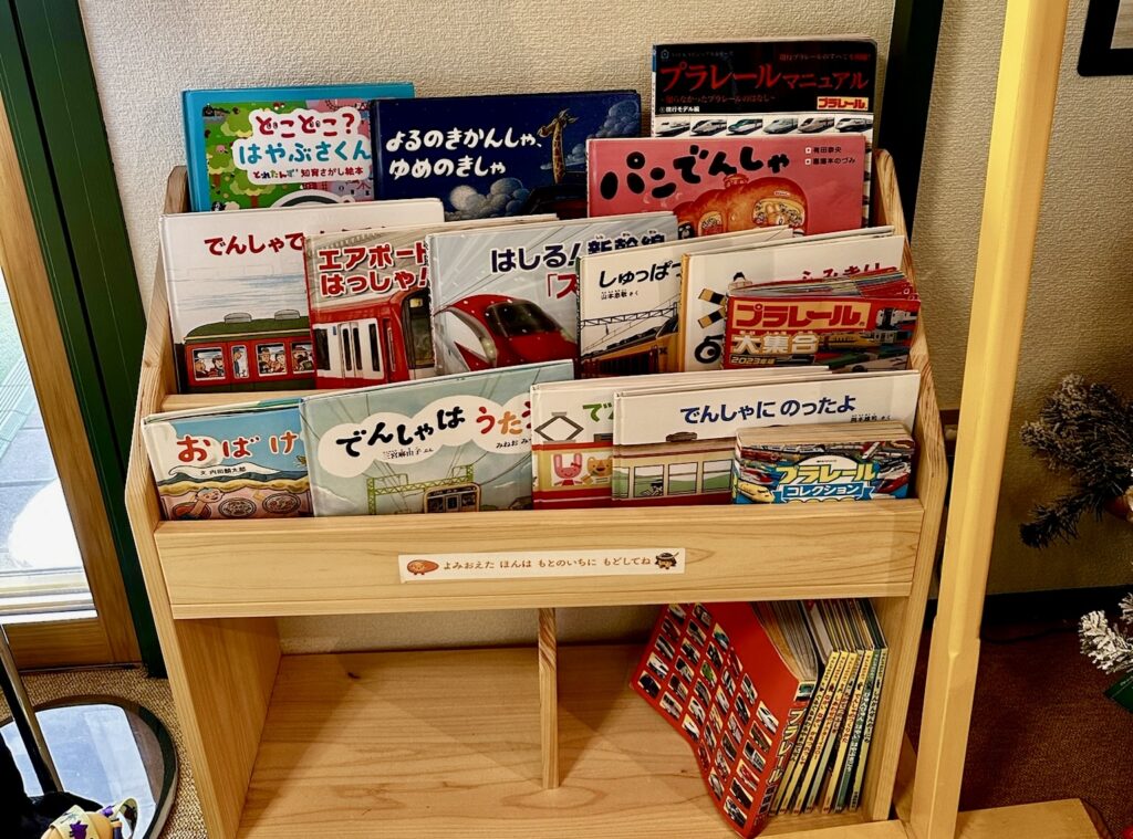 そのほか電車・新幹線の絵本もたくさん置いてあり、鉄道好きの子どもにはたまらないエリアでした!