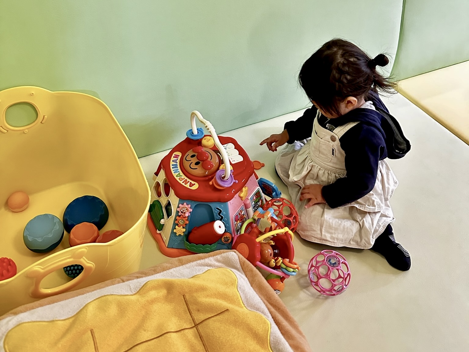 もちろん0〜1歳の子も一緒に楽しめますよ。ハイハイのお部屋には小さな子どもが楽しめるおもちゃも置いてありました♪